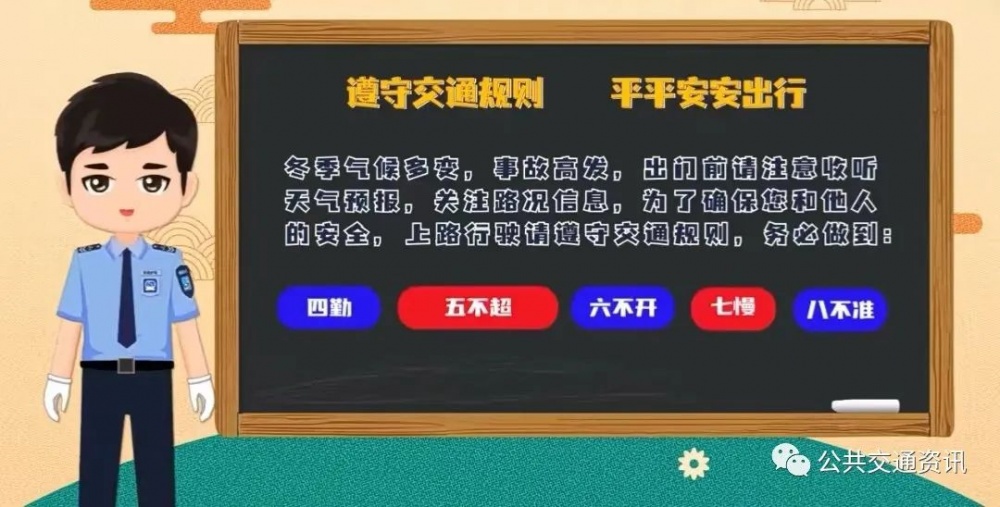 冬季氣候多變,事故高發(fā),出門前請(qǐng)注意收聽天氣預(yù)報(bào),關(guān)注路況信息,為了確保您和他人的安全, 上路行駛請(qǐng)遵守交通規(guī)則,務(wù)必做到:四勤、五不超、六不開、七慢、八不準(zhǔn) 。