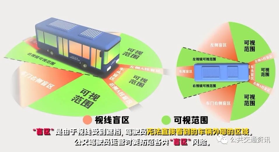 “盲區(qū)”是由于視線受到遮擋,駕駛員無法直接看到的車輛外部的區(qū)域。公交駕駛員運營時要防范各類“盲區(qū)”風(fēng)險。