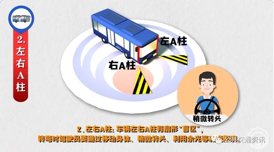 2、左右A柱:車輛左右A柱有扇形“盲區(qū)”,轉(zhuǎn)彎時駕駛員要通過移動身體、稍微轉(zhuǎn)頭、利用余光等減輕影響。