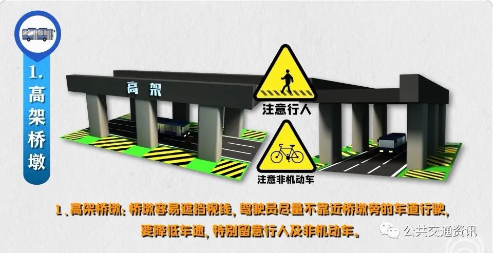 1、高架橋墩:橋墩容易遮擋視線,駕駛員盡量不靠近橋墩旁的車道行駛,要降低車速,特別留意行人及非機動車。