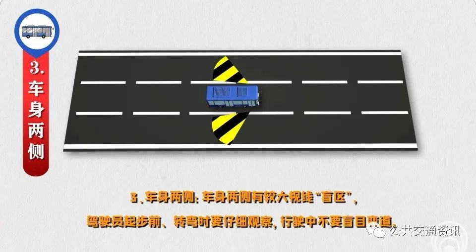 3、車身兩側(cè):車身兩側(cè)有較大視線“盲區(qū)”,駕駛員起步前、轉(zhuǎn)彎時要仔細(xì)觀察,行駛中不要盲目變道。