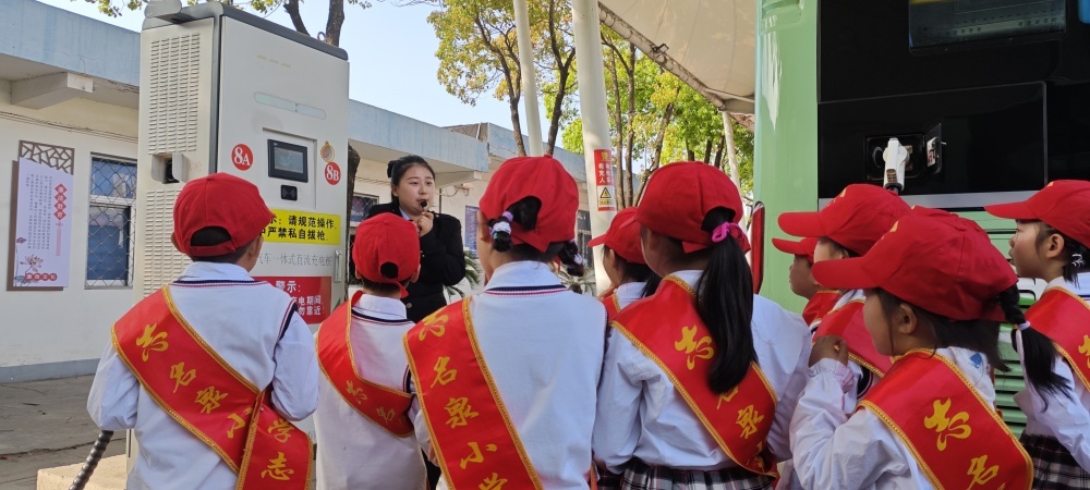 圖/在公交充電站,工作人員向同學(xué)們介紹充電樁的工作原理和純電動公交車的運(yùn)行優(yōu)點。