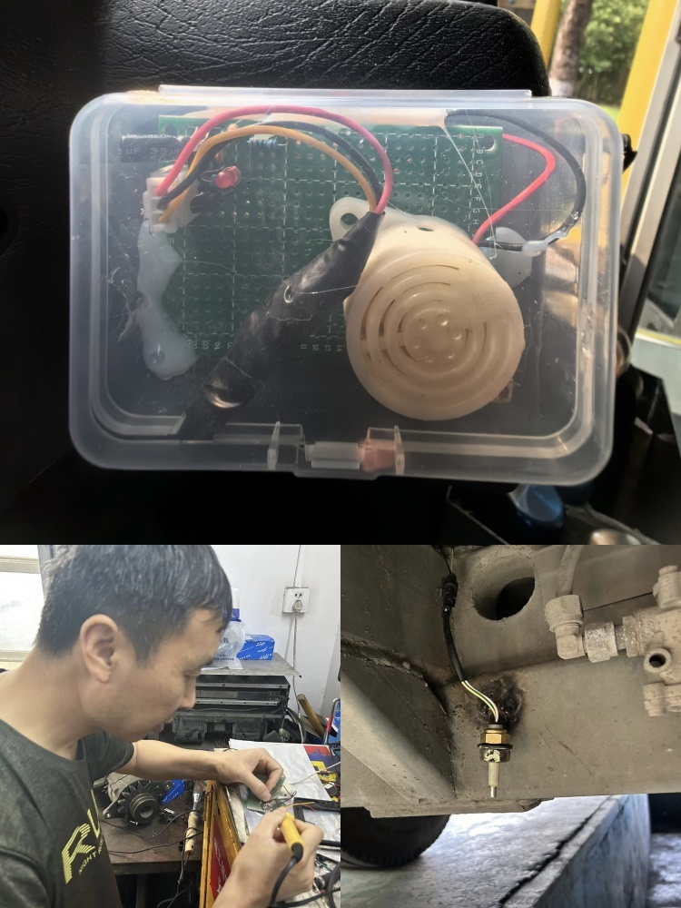 “涉水預(yù)警”裝置工作原理:涉水裝置由普通元器件及蜂鳴器焊接而成,在涉水路面通過傳感器泡水觸發(fā)蜂鳴器報(bào)警,進(jìn)而提醒駕駛員。