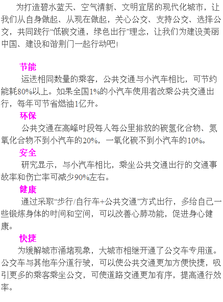 此外,在"公交出行宣傳周"到來之際,荊門公交集團公司呼吁廣大車主,請遵守交通規(guī)則,尤其在上下班高峰期時不要隨意駛入公交專用道。
