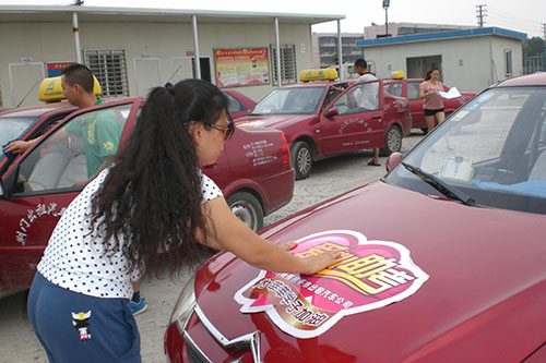 圖5為工作人員為愛(ài)心助考車粘貼活動(dòng)標(biāo)識(shí)