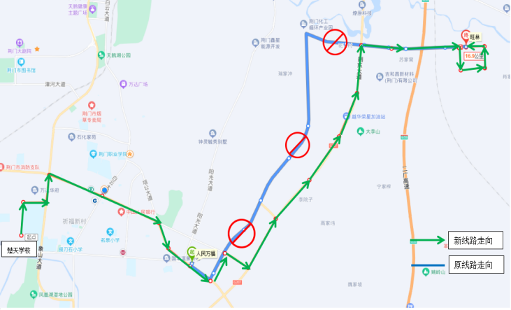 一.優(yōu)化調(diào)整33路公交線路走向 ◆首末站:楚天學(xué)?!郑ㄐ】的下繁保?/p> ◆首末班時間:6:50—17:45 ◆線路走向:響嶺路—運動公園路—象山大道—深圳大道—培公大道—荊和大道—深圳大道—荊東大道—興化三路—格林北路—興化四路—小康南路 ◆停靠站點:楚天學(xué)校、雙喜街辦、運動公園路、萬達廣場、掇刀檢察院、掇刀法院、掇刀公安分局、南城明珠、中國人民銀行、市氣象局、襄荊高速、雙泉社區(qū)、人民萬福商貿(mào)城、人民一品花園、虎頭山、殯儀館、馮廟村、固潤科技、東方雨虹、圣通石化、荊東消防、荊東大道興化五路口、潤都制藥、興化三路西、興化三路中、興化三路盈德氣體、紐蘇萊、旺林、興化四路、小康南路北。 ◆取消原33路途經(jīng)荊和大道等路段站點:荊和大道南、陽光五路、陽光四路、陽光三路、化工產(chǎn)業(yè)園行政大樓。 二.優(yōu)化調(diào)整69路公交發(fā)班時間 ◆調(diào)整前 園博園東門發(fā)班時間:6:40、7:40、15:30、16:30、17:15 玲瓏輪胎發(fā)班時間:7:30、8:30、16:30、17:30、18:00 ◆調(diào)整后 園博園東門發(fā)班時間:6:40、7:20、15:30、16:30 玲瓏輪胎發(fā)班時間:7:30、8:20、12:20、16:20、17:30