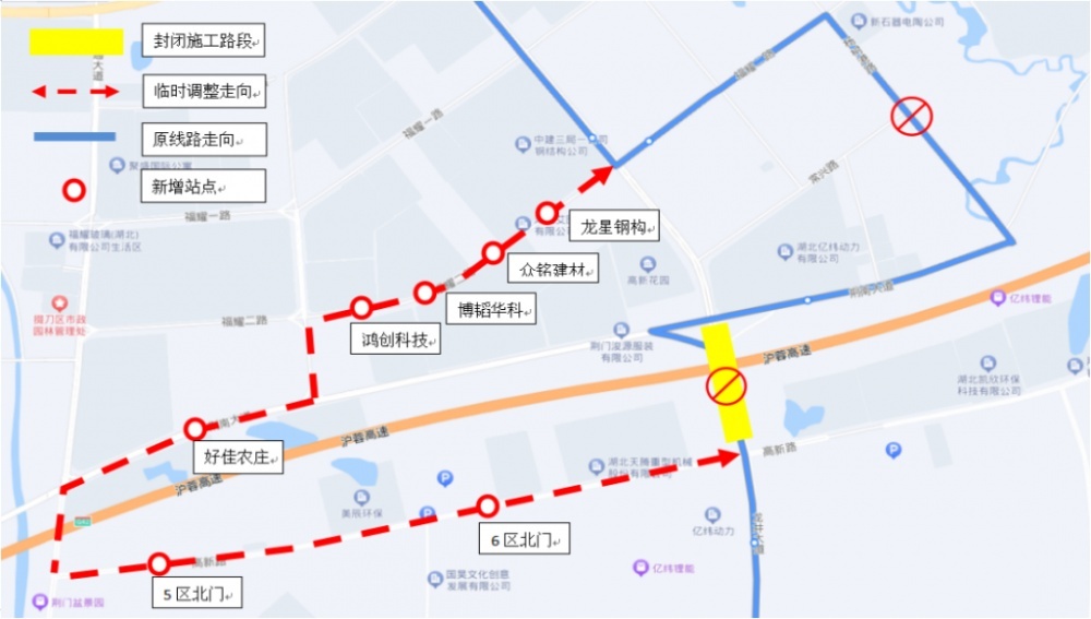 原途經(jīng)荊南大道—龍井大道路段調(diào)整為荊南大道—交通路—高新路—龍井大道